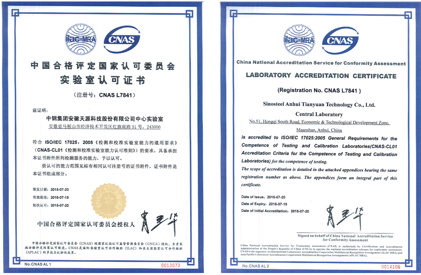 針對現場評審提出的問題和不符合項,公司中心實驗室經過近3個月的整改,于2015年6月初將整改報告遞交至CNAS,CNAS確認了申請認可的多個檢測項目的檢測能力,并于2015年8月4日向中鋼天源中心實驗室頒發了CNAS認可證書。